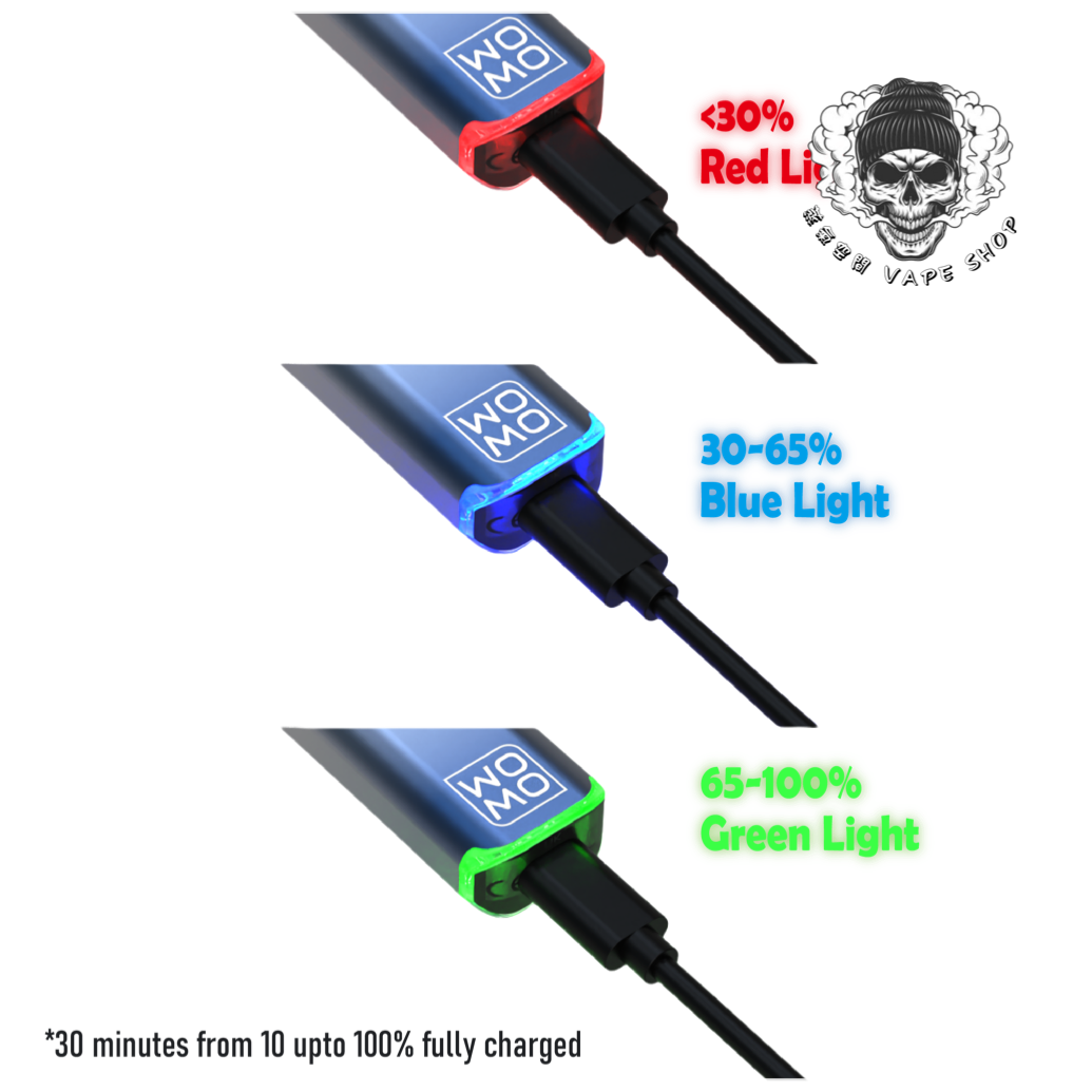 WOMO Slim Plus具備了三檔調節功能(快速按下3次)RGB燈顯示紅色(高)/藍色(中)/